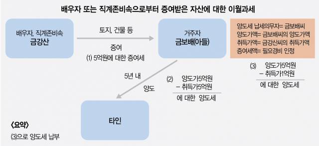 이러한 가족간 거래를 통한 양도세 회피를 막기위한 규정을 양도세 이월과세라고 한다. ‘이월’이란 ‘옮겨서 넘긴다’는 사전적의미가 있는데, 금보배씨의 취득가격과 취득시기를 증여자 금강산씨로 옮겨서 계산하는 방법이다. 특히 배우자간 증여는 6억 원까지도 세금이 나오지 않기 때문에 증여를 한 후에 5년의 기간(등기일 기준)내에는 세액을 잘 따져봐야 한다. 심지어 배우자간 이혼을 해도 이 규정을 적용한다. 게다가 법의 적용 기간을 10년으로 늘리는 세제개편안(2022년7월21일 발표)이 나온 상태다. 단 배우자가 사망하였을 때나 1세대 1주택일 때, 혹은 공익사업수용 등의 경우이거나 이월과세 미적용 세액이 더 큰 경우는 예외이다.