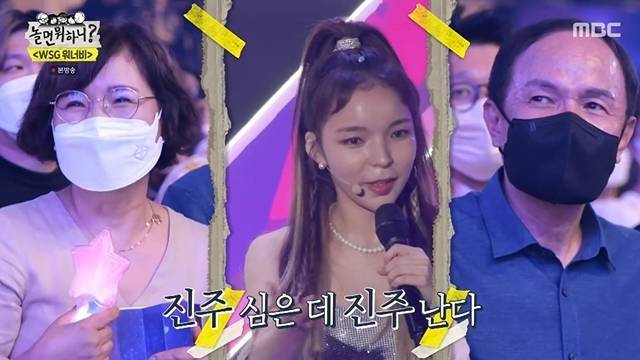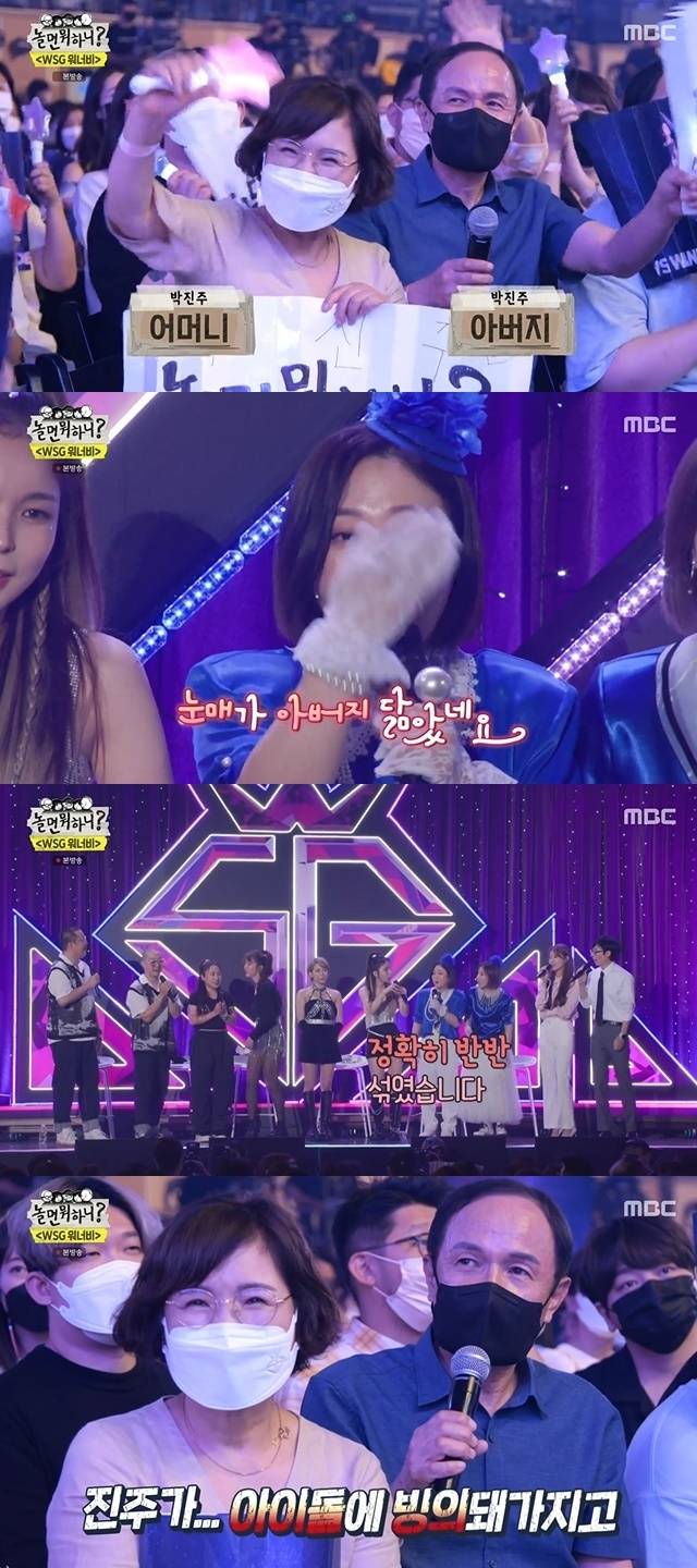 이날 콘서트에는 WSG워너비의 가족들이 객석에 찾아왔다. 이중 특히 눈길을 끈 건 박진주와 똑닮은 부모님. 벌떡 이러나 객석에까지 인사를 드리는 아버지의 모습에 김숙은 "눈매가 아버님을 닮았다"고 평했다.