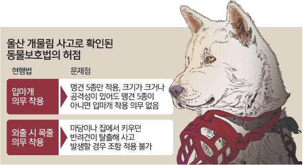 승재현 한국형사·법무정책연구원 연구위원은 “형법상 과실치상은 500만원 이하의 벌금, 구류 또는 과료인데 이는 울산 개물림 사고 피해 아이의 트라우마를 고려하면 너무 낮은 형벌”이라며 “지금처럼 동물보호법의 범위가 협소해 맹견 관리 소홀 때만 처벌한다면 개물림 사고는 계속 발생할 수밖에 없다”고 꼬집었다. 승 연구위원은 “개인적으로는 반려견의 크기에 따라 입마개 기준을 정해야 한다고 본다”고 밝혔다.