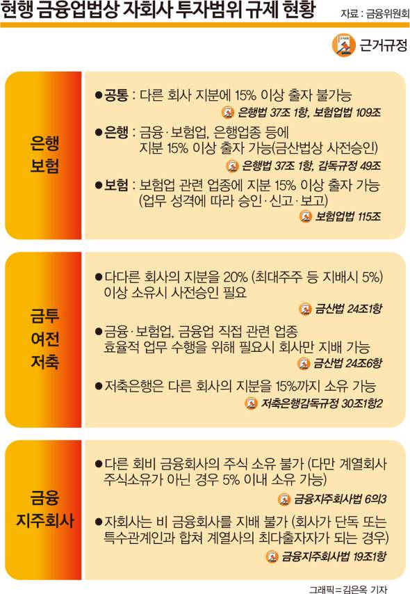 독점규제 및 공정거래에 관한 법률(공정거래법) 제8조의 2(지주회사 등의 행위제한 등) 제2항 5호에 따르면 일반기업으로 이뤄진 지주회사는 금융업이나 보험업을 영위하는 회사의 주식을 취득할 수 없다.
