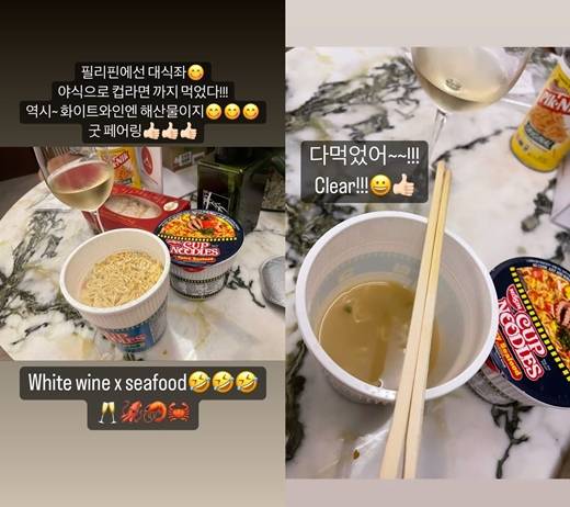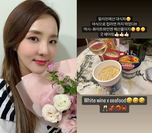 산다라박은 31일 자신의 인스타그램 스토리에 "필리핀에선 대식좌. 야식으로 컵라면까지 먹었다. 역시 화이트 와인엔 해산물이지. 굿 페어링"이라는 글과 함께 사진을 게재했다.