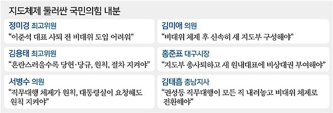 정미경 최고위원도 이날 KBS 라디오에서 “이제 하다 하다 안 되니까 최고위 기능을 상실시키려고 순번을 정해 놓고 한 사람씩 사퇴한다”며 “권 원내대표는 원내대표는 하고 직무대행은 내려놓고”라고 지적했다. 정 최고위원은 이어 “원내대표를 내려놓으면 직무대행은 그냥 내려놓아진다”며 “상식도 없고, 공정도 필요 없는 것처럼 밀어붙이고 있다”고 비판했다.