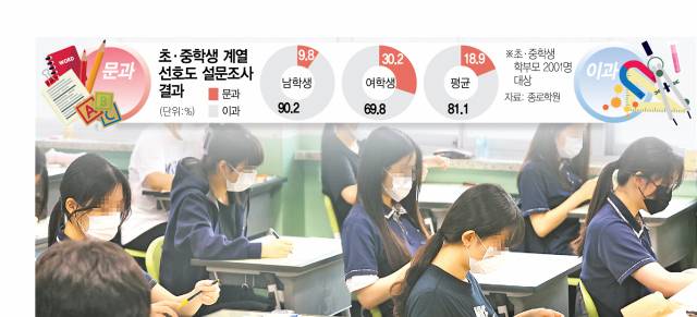 ◇초중학생 10명 중 8명은 ‘이과 선호’···선행 학습도 덩달아 심화=3일 종로학원에 따르면 5월 초등학생과 중학생 학부모 2001명을 대상으로 실시한 설문조사 결과 전체 응답자의 81.1%가 이과를 선호하는 것으로 나타났다. 성별로는 남학생의 90.2%, 여학생의 69.8%가 이과 진학을 희망했다.