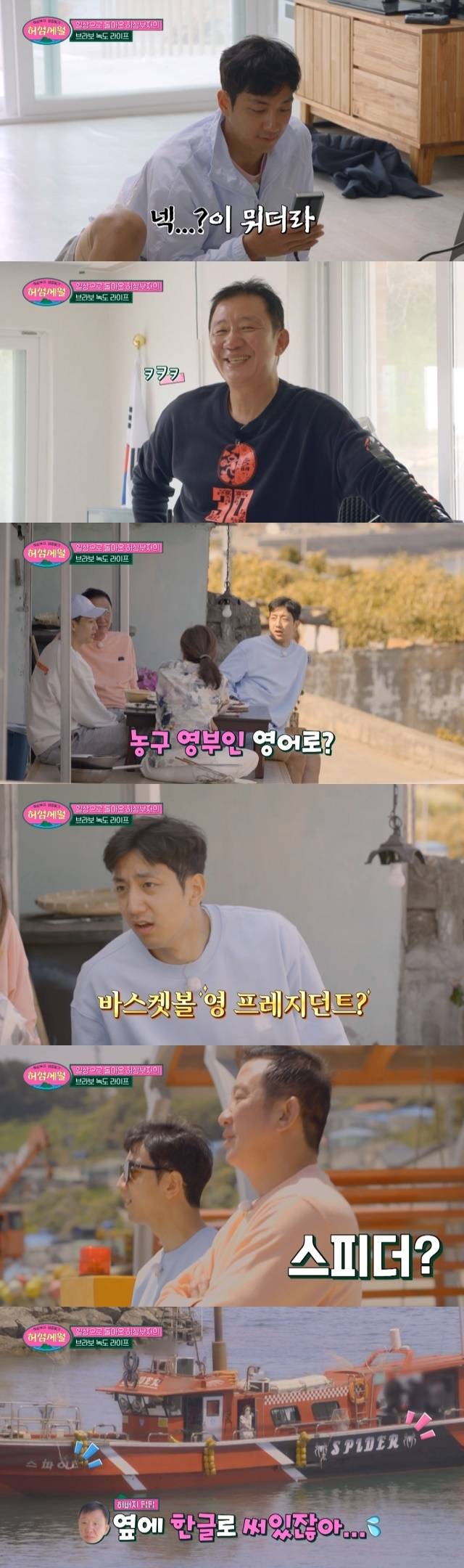 허훈은 "노우, 네버"라며 부인했으나 앞서 허훈은 영부인이 영어로 뭔지 모르고 스파이더를 스피더로 읽는 모습을 꾸준히 보여온 바. 미국 부촌 베버리힐스에서 공부하고도 처참한 영어 실력을 가진 허훈이 웃음을 안겼다. (사진=JTBC '허섬세월 – 허삼부자 섬집일기' 캡처)