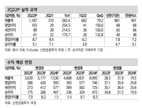 정용진 신한금융투자 연구원은 이날 보고서에서 “2분기 실적은 지난달 잠정실적 공시에서 먼저 확인할 수 있었다. 매출 1조1900억원, 영업이익 1029억원으로 2021년 연간 영업이익(1150억원)에 준하는 실적”이라고 강조했다.