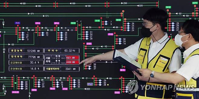 (서울=연합뉴스) 임헌정 기자 = 폭염으로 전력수요가 급증한 가운데 4일 서울 중구 한국전력공사 서울본부 광역계통운영센터에서 직원들이 전력수급 상황을 점검하고 있다. 2022.8.4 [공동취재]