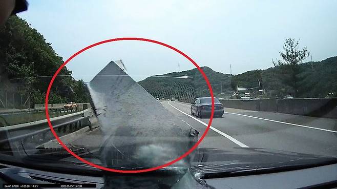 떨어진 알루미늄 폼은 앞서가던 차량이 밟고 지나가면서 튀어 올랐고 곧바로 뒤차량 앞 유리에 내리꽂혔습니다.