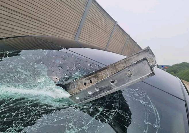 고속도로를 달리던 차량에 난데없이 쇳덩이가 날아들어 앞 유리를 관통하는 사고가 발생했습니다.