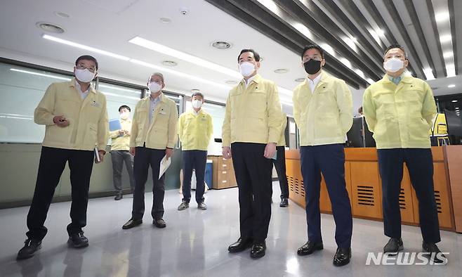 [서울=뉴시스] 김금보 기자 = 이창양 산업통상자원부 장관이 4일 오전 서울 중구 한국전력공사 서울본부 전력관리처 광역계통운영센터에서 여름철 전력수급 현장점검을 하고 있다. 2022.08.04. kgb@newsis.com