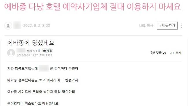 에바종으로 베트남 다낭 여행을 계획한 누리꾼 A 씨는 여행 관련 온라인 커뮤니티에 황당한 일을 겼었다고 글을 올리며 "체크인을 이틀 앞두고 에바종 측에서 '고객님의 (호텔) 체크인 전에 해당 금액을 송금했어야 하나, 현재 회사의 자금 이슈로 송금이 불발돼 해당 건의 결제가 돼 있지 않다'는 문자를 보냈다"고 피해 사례를 공유했습니다.