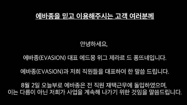 이 같은 상황 속에서 에바종은 지난 2일 돌연 사무실을 닫고 SNS를 통해 "투자 유치 및 인수 합병 등의 방안을 협의 중이니 조금만 기다려주시면 환불 예정 및 일자를 안내해드리겠다"는 내용의 공지 만을 남기면서 소비자들의 불안감은 커져가고 있습니다.