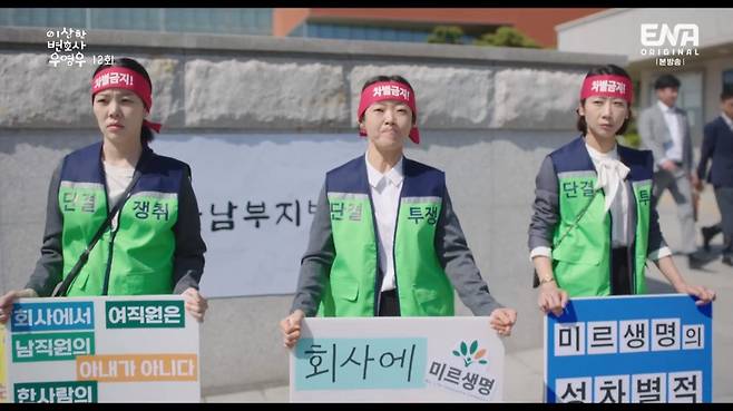 그 가운데 소를 제기한 김현정, 이지영 두 사람은 업무도 곧 잘하던 직원들. 원고 측의 류재숙 변호사는 법원 앞에서 성차별적 구조조정에 항의하는 시위를 펼치며 만만치 않은 기세를 드러냈다. 학연, 지연, 혈연을 따지는 류명하 판사(이기영 분)는 어김없이 재판 전 본관을 물었고 재숙은 같은 풍산 류 씨지만 명하보다 항렬이 높은 숙모뻘로 밝혀져 우위에 서게 됐다.