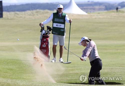 Jin Young Ko of South Korea plays from the bunker on the 11th green during the first round of the Women's British Open golf championship, in Muirfield, Scotland Thursday, Aug. 4, 2022. (AP Photo/Scott Heppell)