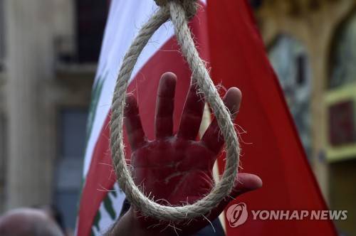 epa10105939 An activist raises his hand painted in red next to a mock gallows during a protest on the second anniversary of the Beirut Port explosion, in Beirut, Lebanon, 04 August 2022. Lebanon marks two years since a blast ravaged the Beirut port area, killing at least 200 people and injuring thousands more on 04 August 2020. It is believed to have been caused by an estimated 2,750 tons of ammonium nitrate stored in a warehouse. EPA/WAEL HAMZEH