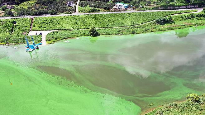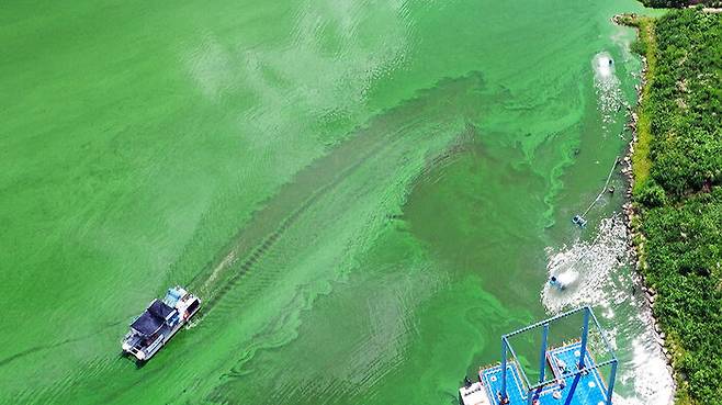 강물이 온통 짙은 녹색입니다. 와인잔에 담겨 있는 물은 녹조 범벅으로 죽처럼 걸쭉합니다.