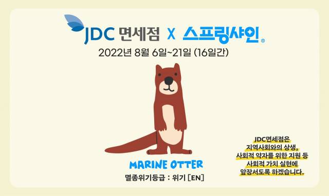 스프링샤인 김종수 대표는 “이번 JDC면세점과 함께하는 프로모션이 발달장애인에 대한 편견 및 인식 개선은 물론 바다수달 보호의 중요성 인지에 도움이 되길 바란다”며 “스프링샤인은 지역 사회와의 상생, 약자를 위한 지원 등 사회적 가치 실현에 앞장설 것”이라고 말했다.