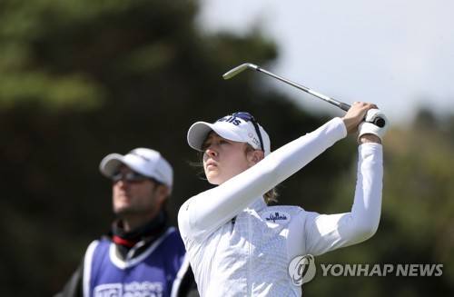 United States' Nelly Korda plays her tee shot from the 16th during the second round of the Women's British Open golf championship, in Muirfield, Scotland Friday, Aug. 5, 2022. (AP Photo/Scott Heppell)