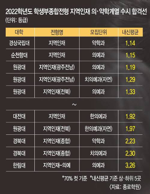 종로학원이 5일 분석한 ‘2022학년도 의·약학계열 학생부전형 수시 합격선’(70%컷)을 보면 지역인재 전형에서도 의·약학계열의 학생부교과전형 커트라인이 대부분 1등급대였다. 우석대 약학과와 한의예과(자연)는 1.00 등급(이하 ‘등급’ 생략)으로 매우 높았고, 충북대 의예과와 약학과의 경우 각각 1.06, 1.07이었다. 커트라인이 가장 낮은 의·약학계열은 영남대 약학부로 2.41이었다. 제주대 수의예과 1.98, 경성대 약학과 1.87, 전북대 수의예과 1.85로 나타났다. 의대 중에는 전북대와 영남대가 1.68로 가장 낮았다.