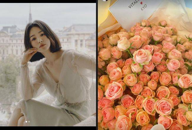 송혜교, 백송이 꽃다발 받는 클라쓰..누구한테 받았나
