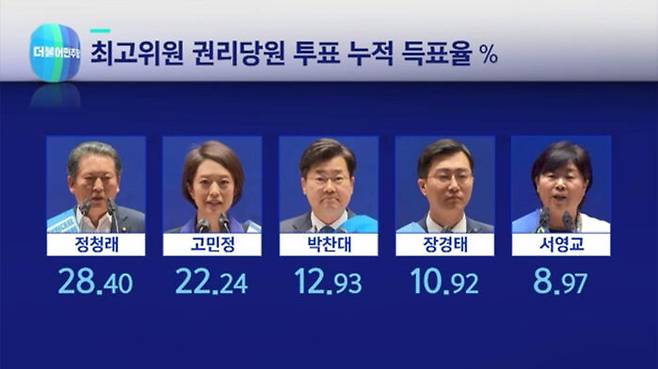 최고위원 경선에서는 정청래 의원이 누적 득표율 28.4%로 1위를 차지했고, 이어 고민정, 박찬대, 장경태, 서영교 의원, 그리고 윤영찬, 고영인, 송갑석 의원 순이었습니다.