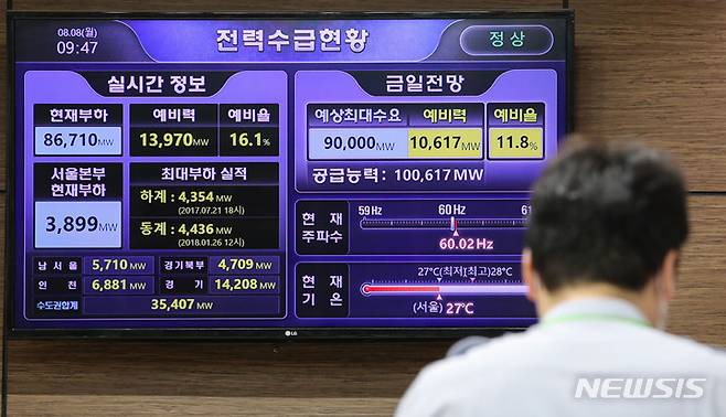 [서울=뉴시스] 권창회 기자 = 전국적으로 무더위와 열대야가 지속되고 산업 현장에서는 여름 휴가에서 복귀하는 인력이 늘면서 전력 수요가 증가할 것으로 예상된다. 8일 오전 서울 중구 한국전력공사 서울본부에 설치된 전광판에 실시간 전력수급 현황이 표시돼있다. 2022.08.08. kch0523@newsis.com