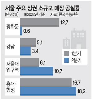 하지만 서울 시내 대학상권은 신촌·이대 상권의 공실률이 1분기 13.8%에서 2분기 9.0%로 낮아졌을 뿐 나머지 지역은 오히려 높아졌다.