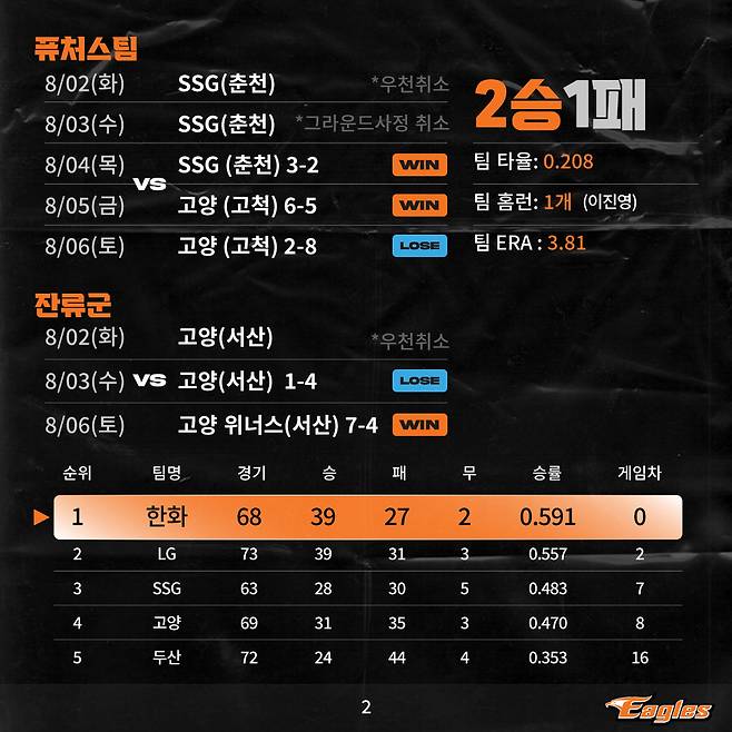 (MHN스포츠 박연준 기자) 최원호 감독이 이끄는 한화이글스 퓨처스팀 서산이글스가 지난주 3경기에서 2승을 챙기며 상승세를 이어갔다.