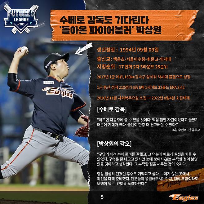수베로도 기다린다.. '파이어볼러' 박상원 호투, 서산 이글스 위클리 리포트