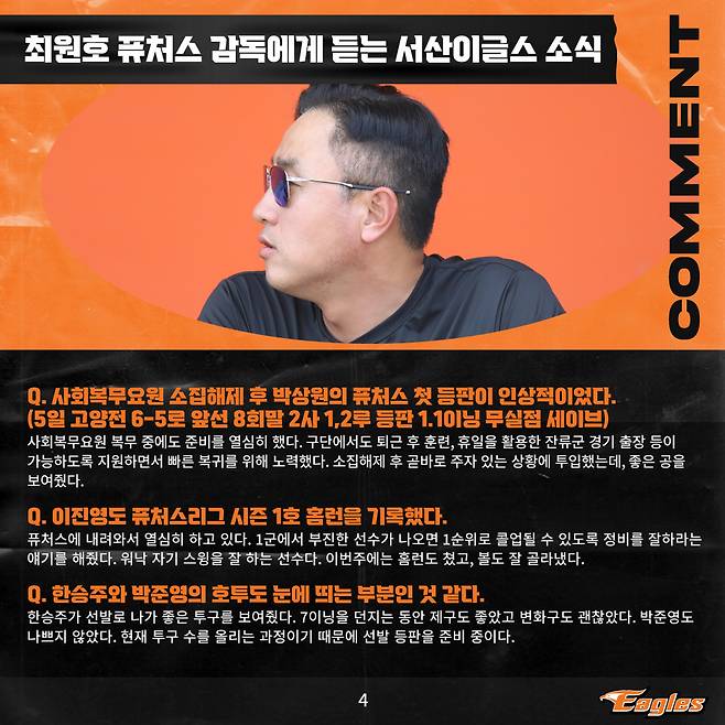 최원호 감독은 "사회복무요원 복무 중에도 준비를 열심히 했다. 구단에서도 퇴근 후 훈련, 휴일을 활용한 잔류군 경기 출장 등이 가능하도록 지원하면서 빠른 복귀를 위해 노력했다. 소집해제 후 곧바로 주자 있는 상황에 투입했는데, 좋은 공을 보여줬다"고 퓨처스 첫 등판을 성공적으로 마친 박상원을 칭찬했다.