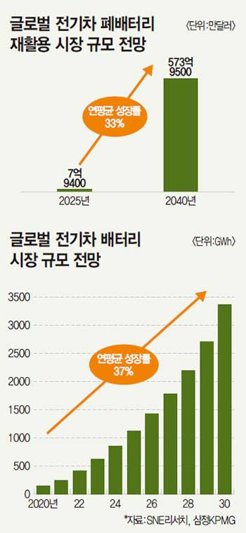 전기차 시장이 가파르게 성장하면서 수명을 다한 폐배터리를 재사용·재활용하는 사업도 미래 먹거리로 각광받는다. 전기차 배터리는 충전과 방전을 거듭하면 성능이 점차 떨어진다. 성능이 초기 대비 70~80% 이하로 떨어지면 폐배터리로 분류된다. 폐배터리 재사용·재활용은 이렇게 성능이 저하된 배터리를 에너지저장장치(ESS)에 설치하는 등 다른 용도로 재사용하거나 배터리에서 금속을 추출해 재활용하는 것을 가리킨다. 환경을 보호할 수 있고 전기차 가격 인하로 이어질 수 있다는 점에서 가파른 성장이 기대되는 분야로 꼽힌다. SNE리서치와 삼정KPMG에 따르면 글로벌 전기차 폐배터리 재활용 시장 규모는 2025년 7억9400만달러에서 2040년 573억9500만달러로 성장하며 연평균 성장률 33%를 기록할 것으로 예상된다.