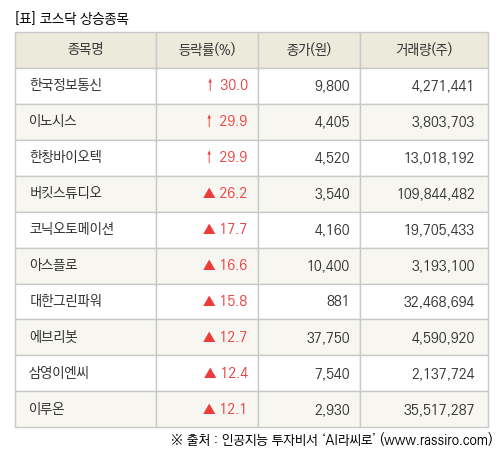 [fnRASSI]장마감, 코스닥 상승 종목(한국정보통신 30.0% ↑)