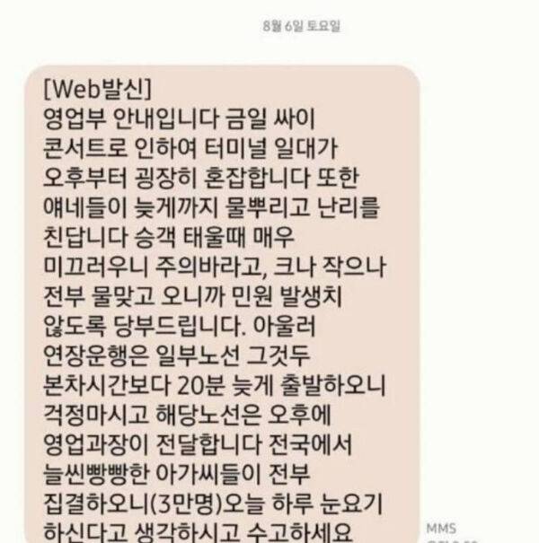 문자 메시지에는 "영업부 안내다. 금일 싸이 콘서트로 인해 터미널 일대가 오후부터 매우 혼잡하다"며 "늦게까지 물 뿌리고 난리를 친다더라. 승객 태울 때 매우 미끄러우니 주의 바라고, 민원 발생치 않도록 당부드린다" 등 안전에 주의를 기울일 것을 당부하는 내용이 담겨 있었습니다.