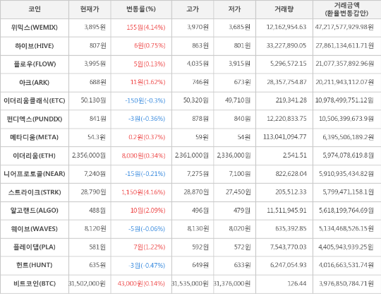 또한, 위믹스(4.14%, 3,895원), 알고랜드(2.09%, 488원), 아크(1.62%, 688원), 플레이댑(1.22%, 581원), 하이브(0.75%, 807원), 메타디움(0.37%, 54.3원), 이더리움(0.34%, 2,356,000원), 플로우(0.13%, 3,995원)가 상승세를 나타냈다.