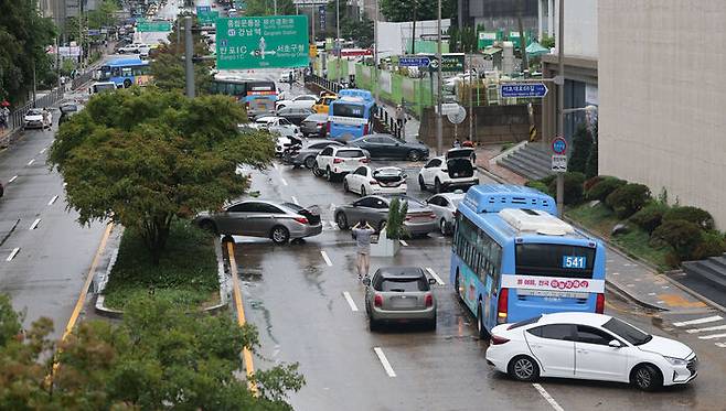 9일 오전 서울 서초구 진흥아파트 앞 서초대로 일대에서 전날 내린 폭우에 침수됐던 차량이 모습을 드러내고 있다.
