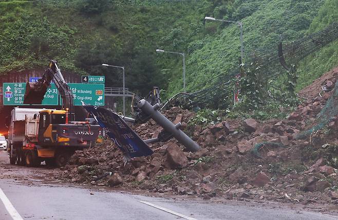 9일 오전 경기도 성남시 용인서울고속도로 용인 방면 하산운터널 입구 경사면 토사가 전날부터 내린 많은 비로 무너져 도로가 통제되고 있다.
