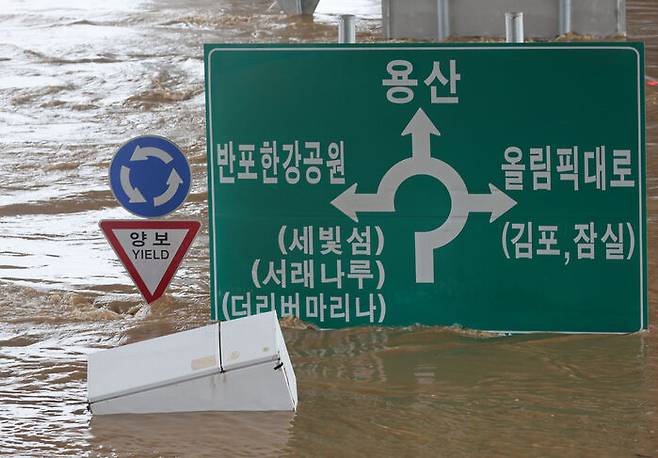 9일 오전 밤 사이 내린 폭우로 물에 잠긴 서울 잠수교에 냉장고가 떠내려가고 있다.