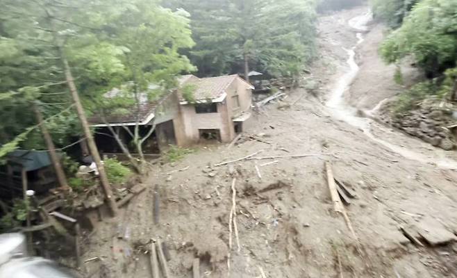 9일 오전 경기 광주시 남한산성면의 한 마을에 산사태가 발생해 토사와 부러진 나무들이 도로에 뒤덮여 있다.
