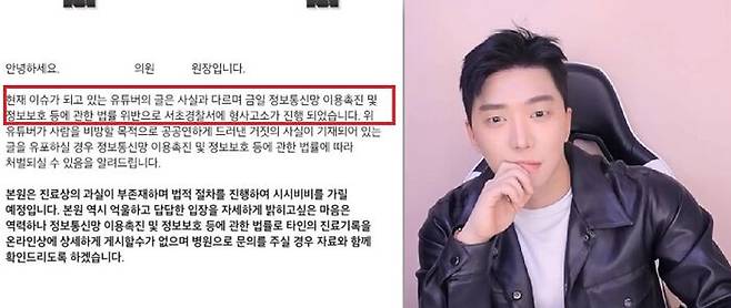 병원 측은 홈페이지 공지 글을 통해 "현재 이슈가 되는 유튜버의 글은 사실과 다르며 금일 정보통신망 이용촉진 및 정보보호 등에 관한 법률 위반으로 서초 경찰서에 형사고소가 진행됐다."면서 "위 유튜버가 사람을 비방할 목적으로 공공연하게 드러낸 거짓의 사실이 기재된 글을 유포할 경우 처벌될 수 있다."고 경고했다.