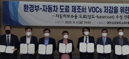 지난 5일 대한상공회의소에서 열린 이번 협약식은 삼화페인트를 비롯한 국내외 도료 업체 9곳과 한국페인트잉크공업협동조합 등이 참여해 자동차보수용 도료(상도-basecoat)의 수성 전환을 약속했다.