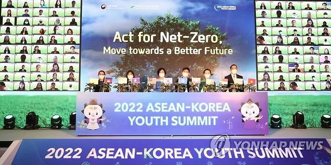 (서울=연합뉴스) 이기순 여성가족부 차관이 9일 오후 서울 강서구 국제청소년센터에서 열린 '2022 한·아세안 청소년 서밋 개회식'에서 화상회의로 참여한 외국참가자와 개회 축하 세리머니를 하고 있다. 2022.8.9 [여성가족부 제공. 재판매 및 DB 금지]