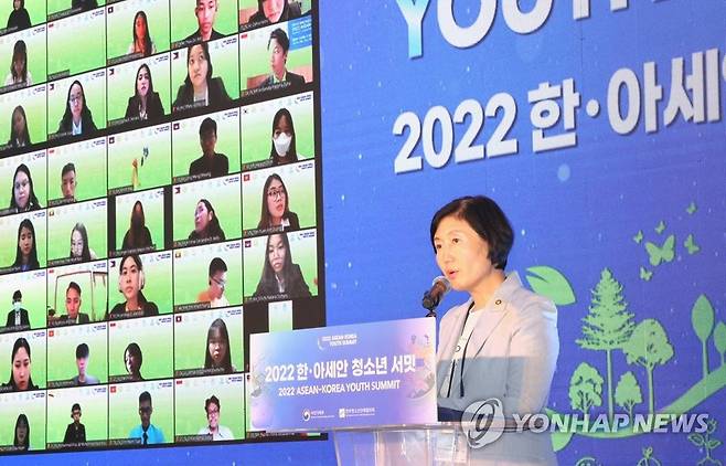 (서울=연합뉴스) 이기순 여성가족부 차관이 9일 오후 서울 강서구 국제청소년센터에서 열린 '2022 한·아세안 청소년 서밋 개회식'에 참석해 축사하고 있다. 2022.8.9 [여성가족부 제공. 재판매 및 DB 금지]