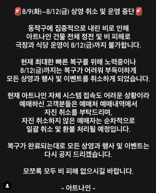 이어 "자진 취소하지 않은 예매 내역의 경우 순차적으로 일괄 취소 및 환불 처리 될 예정"이라며 "동작구에 집중적으로 내린 비로 인해 아트나인 건물 전체 정전 및 비 피해로 극장과 식당 운영이 8/12(금)까지 불가하다"라고 덧붙였다.
