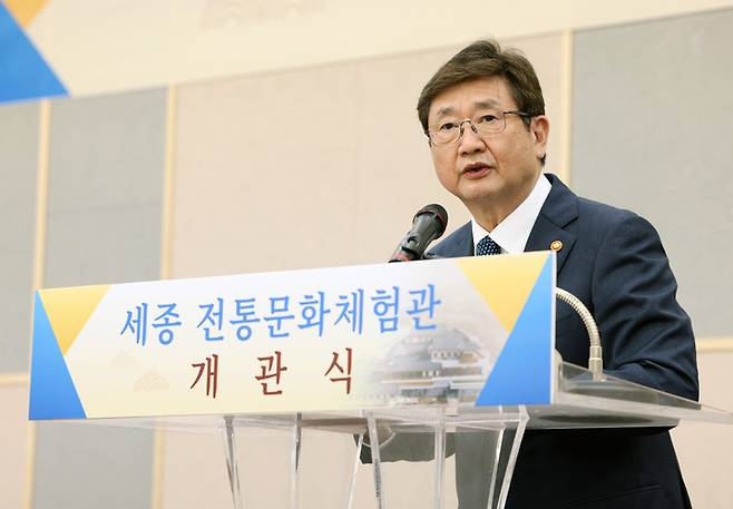 [서울=뉴시스] 김진아 기자 = 박보균 문화체육관광부 장관이 9일 세종시 어진동 세종 전통문화체육관 개관식에 참석해 축사를 하고 있다. (사진=문화체육관광부 제공) 2022.08.09. photo@newsis.com *재판매 및 DB 금지