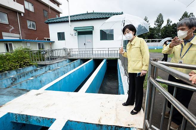 [서울=뉴시스] 김진아 기자 = 한화진 환경부 장관이 9일 오후 집중호우로 침수되었던 경기도 과천시 과천하수처리장을 방문해 피해현장을 점검하고 있다. (사진=환경부 제공) 2022.08.09. photo@newsis.com *재판매 및 DB 금지