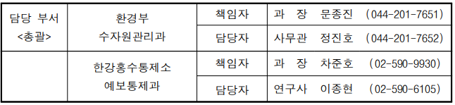 한편, 환경부는 집중호우에 따른 위험요인이 완전히 해소될 때까지 '홍수대책상황실'을 운영하여, 기관별 대비 태세를 점검하고 관계부처, 지자체 등과 유기적으로 대응할 계획이다.