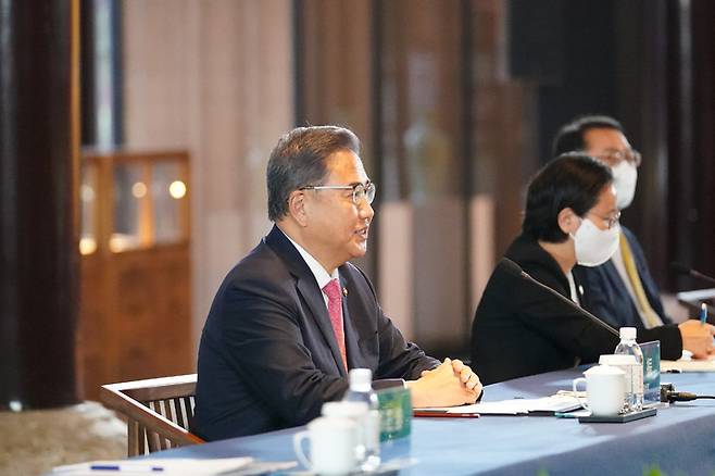 [서울=뉴시스] 김진아 기자 = 박진 외교부 장관이 9일 중국 산둥성 칭다오에서 왕이(王毅) 중국 국무위원 겸 외교부장과 한·중 외교장관 회담을 하고 있다. (사진=외교부 제공) 2022.08.09. photo@newsis.com *재판매 및 DB 금지