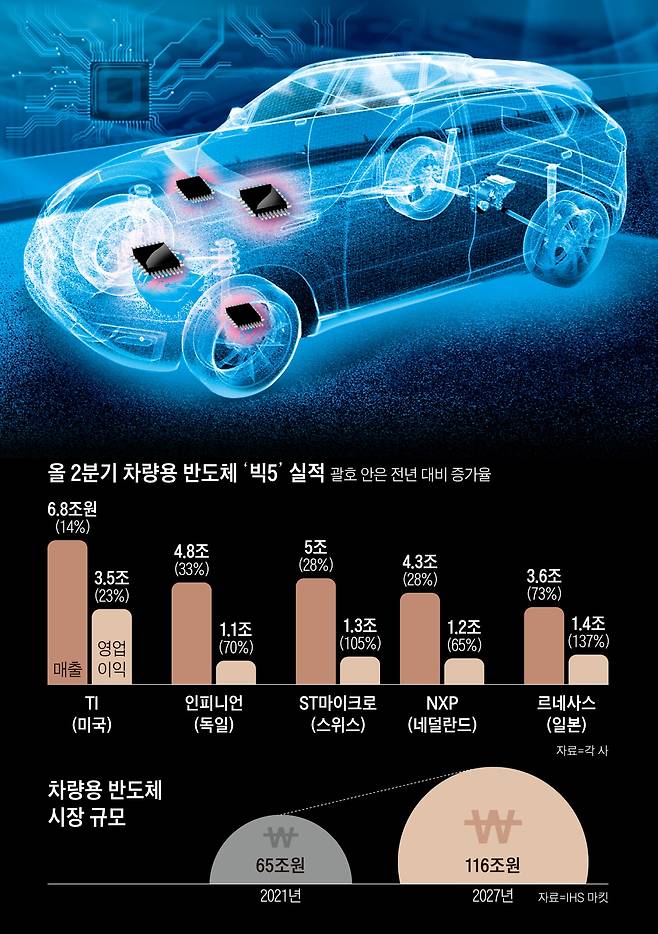 지난해 차량용 반도체 시장의 절반을 차지한 빅5사는 올 2분기에도 괄목할만한 실적 개선을 이뤘다. 매출 규모가 가장 큰 미국 텍사스인스트루먼트(TI)는 매출액 52억1200만달러(약 6조8047억원), 영업이익 27억2300만 달러(약 3조5551억원)를 기록했다. 이는 지난해 같은 기간보다 매출은 14%, 영업이익은 23% 증가한 수치로 영업이익률이 50%를 넘어섰다. MCU(마이크로컨트롤유닛)나 전력 반도체 등 자동차 전자 장비에 많이 쓰이는 저가형 반도체의 가격이 몇 배씩 오른 덕분이다. NXP와 르네사스도 영업이익이 전년 동기보다 65%, 137% 증가했다. <그래픽 참조>