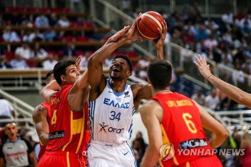 epa10112918 Greece?s player Giannis Antetokounmpo (C) in action against Spain?s Jaime Pradilla (L), during the friendly basketball match Greece va Spain, at the Olympic Indoor Stadium in Athens, Greece, 09 August 2022. EPA/GEORGIA PANAGOPOULOU