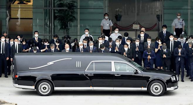 | ▲ 지난 7월 12일 오후 일본 도쿄도 지요다구 소재 일본 총리관저에서 기시다 후미오 일본 총리 등 일본 정부 관계자들이 아베 신조 전 총리의 관을 실은 장의차를 향해 손을 모으고 고개를 숙이고 있다. |