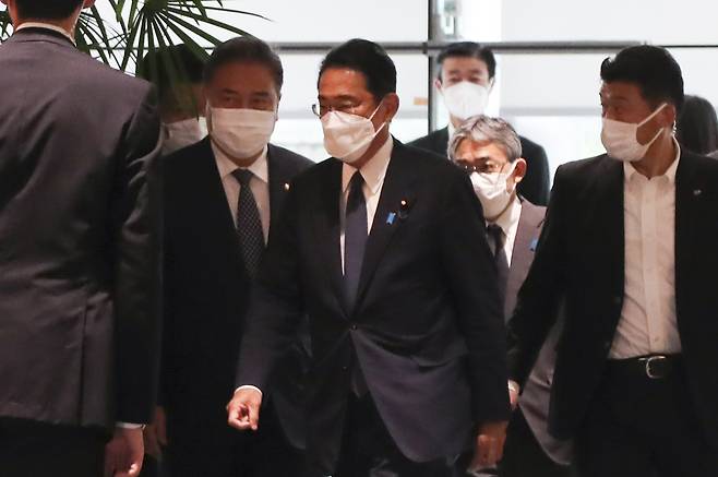 | ▲ 지난 7월 19일 오후 일본 도쿄도 지요다구 소재 일본 총리관저에서 박진 한국 외교부 장관과 기시다 후미오 일본 총리가 면담을 마치고 이동하고 있다. |